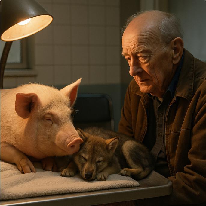 De l’autre côté de la pièce, les deux créatures gisaient sur des tables séparées, sous des lampes chaudes. La poitrine de la truie se soulevait et s’abaissait lentement, son corps recouvert de couvertures et de bouillottes. La plus petite – l’étrange hybride chien-loup – était blottie dans une boîte tapissée de serviettes près du radiateur, sa petite poitrine palpitant au rythme d’une respiration superficielle. La scène était à la fois déchirante et miraculeuse.